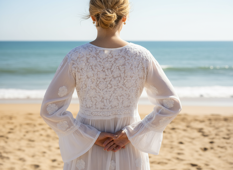 Bloom in elegance with Daisy, a luxurious white georgette knee-length dress adorned with delicate Chikankari hand embroidery. Inspired by the purity of daisy petals, its flowing design exudes charm and sophistication. Perfect for any occasion, let your style blossom effortlessly!